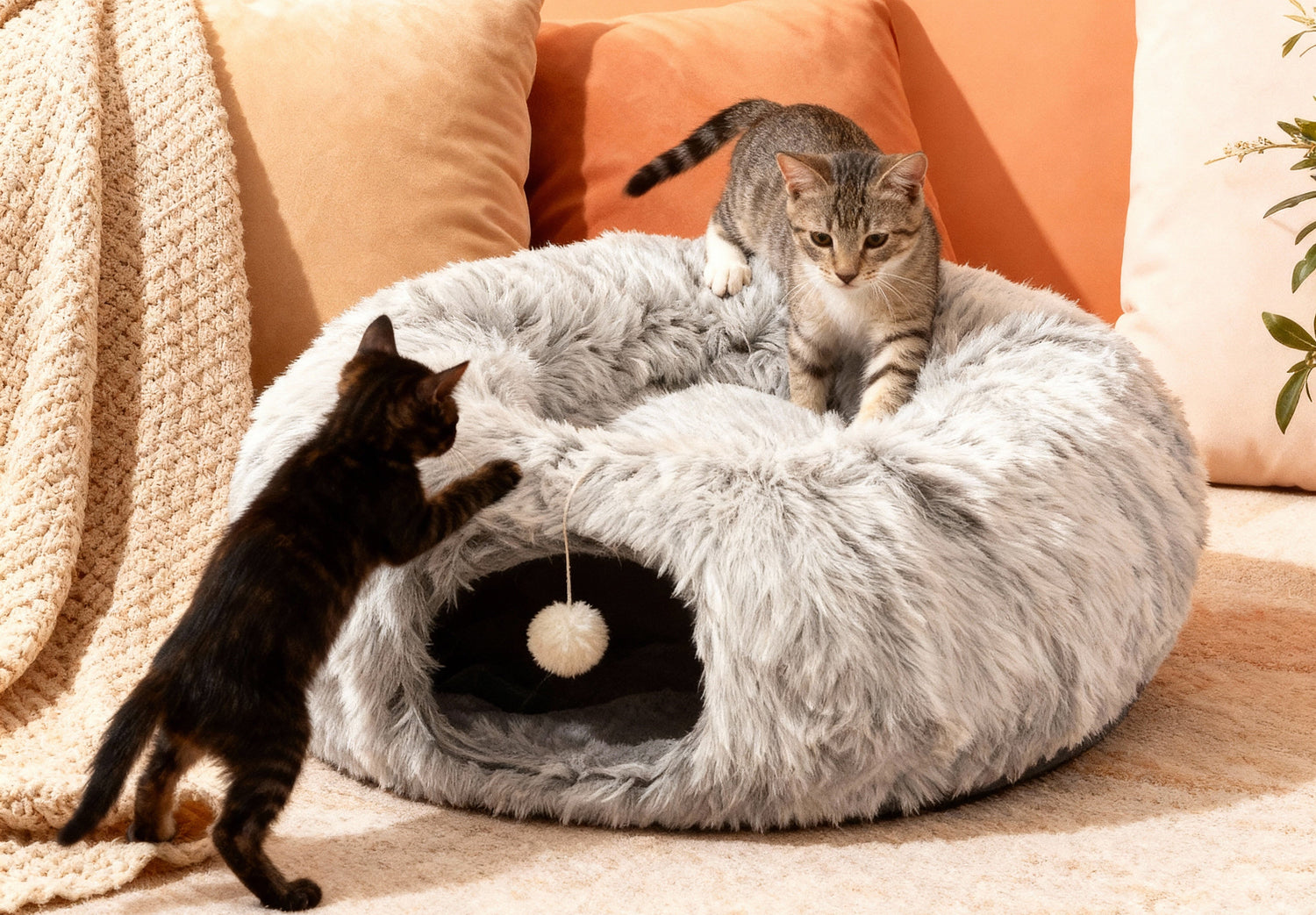 This cat bed with a tunnel isn’t just for solo naps — it’s a fun space for multiple cats to explore, chase, and play together. The tunnel encourages interactive games, social bonding, and healthy activity, giving every cat a chance to hide, pounce, and enjoy cozy comfort side by side. Perfect for multi-cat households, it keeps everyone entertained while still offering a secure place to rest.
